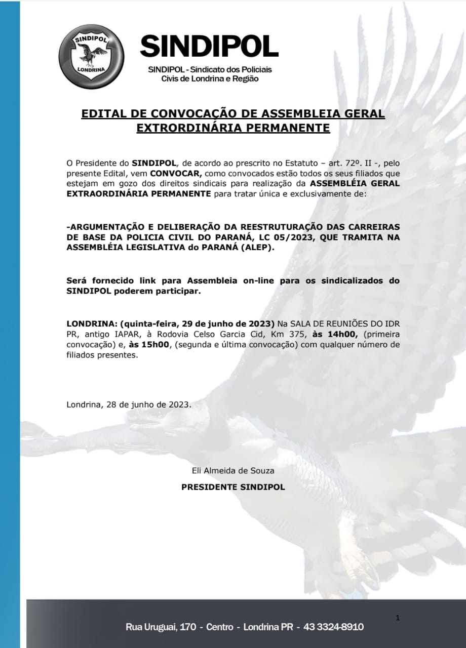 O Presidente do SINDIPOL, de acordo ao prescrito no Estatuto – art. 72º. II -, pelopresente Edital, vem CONVOCAR, como convocados estão todos os seus